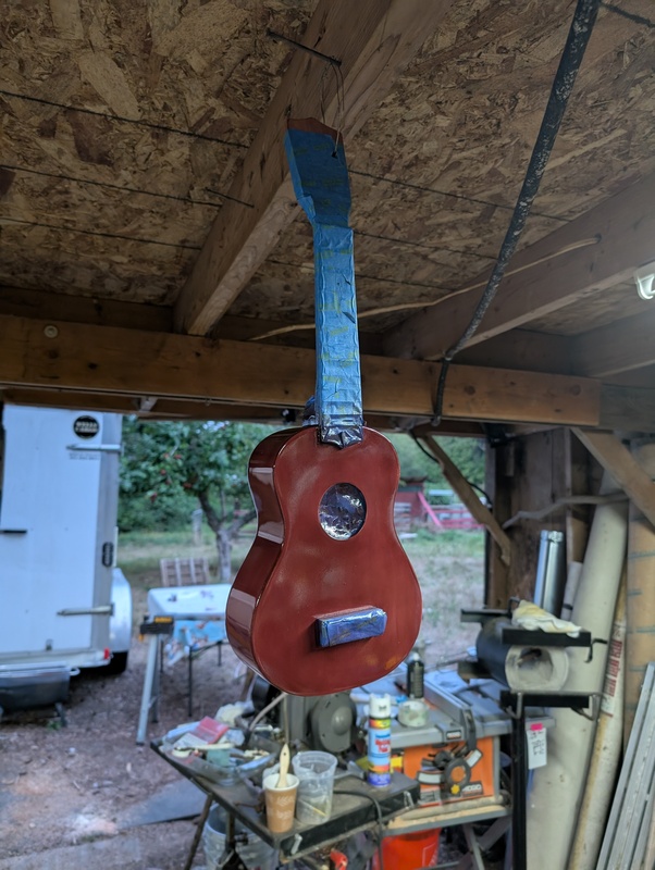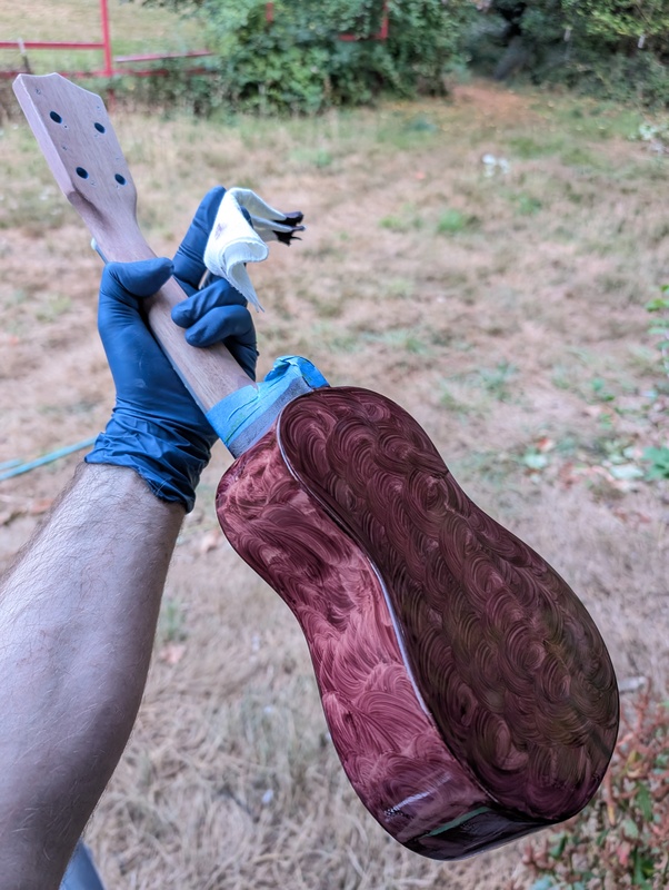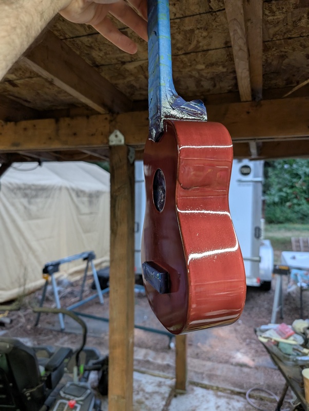 It’s splotchy and imperfect, but still a major improvement, I think! Plus, I learned a lot about oil based stains and finishes. I’ll still keep messing with it from time to time. I want to change the color of the blue fret inlay markers least.